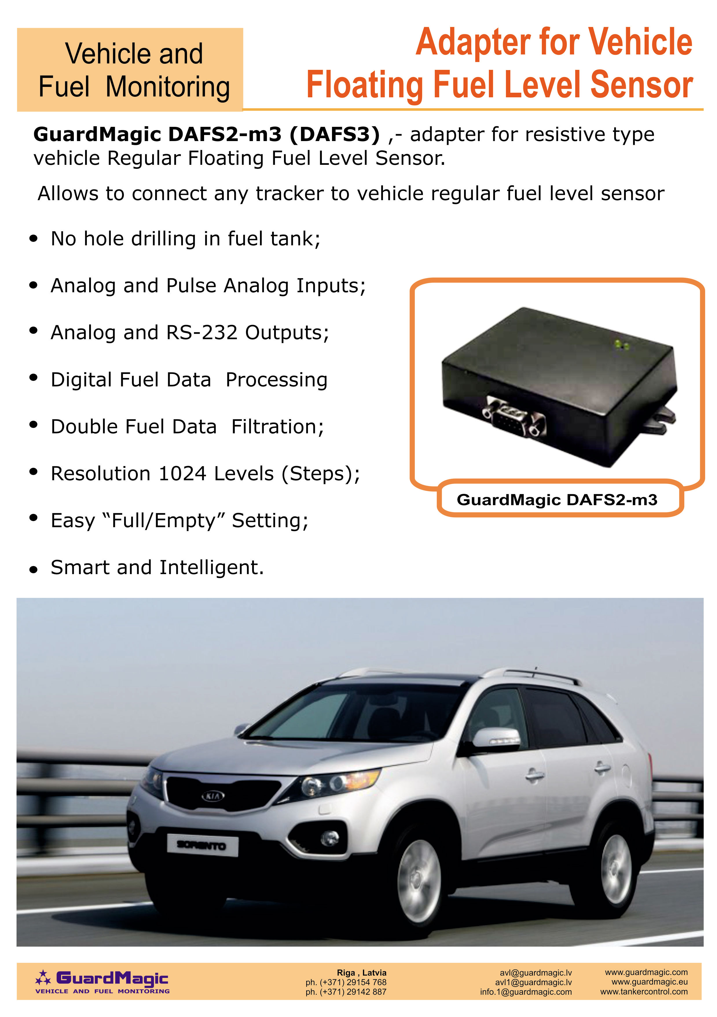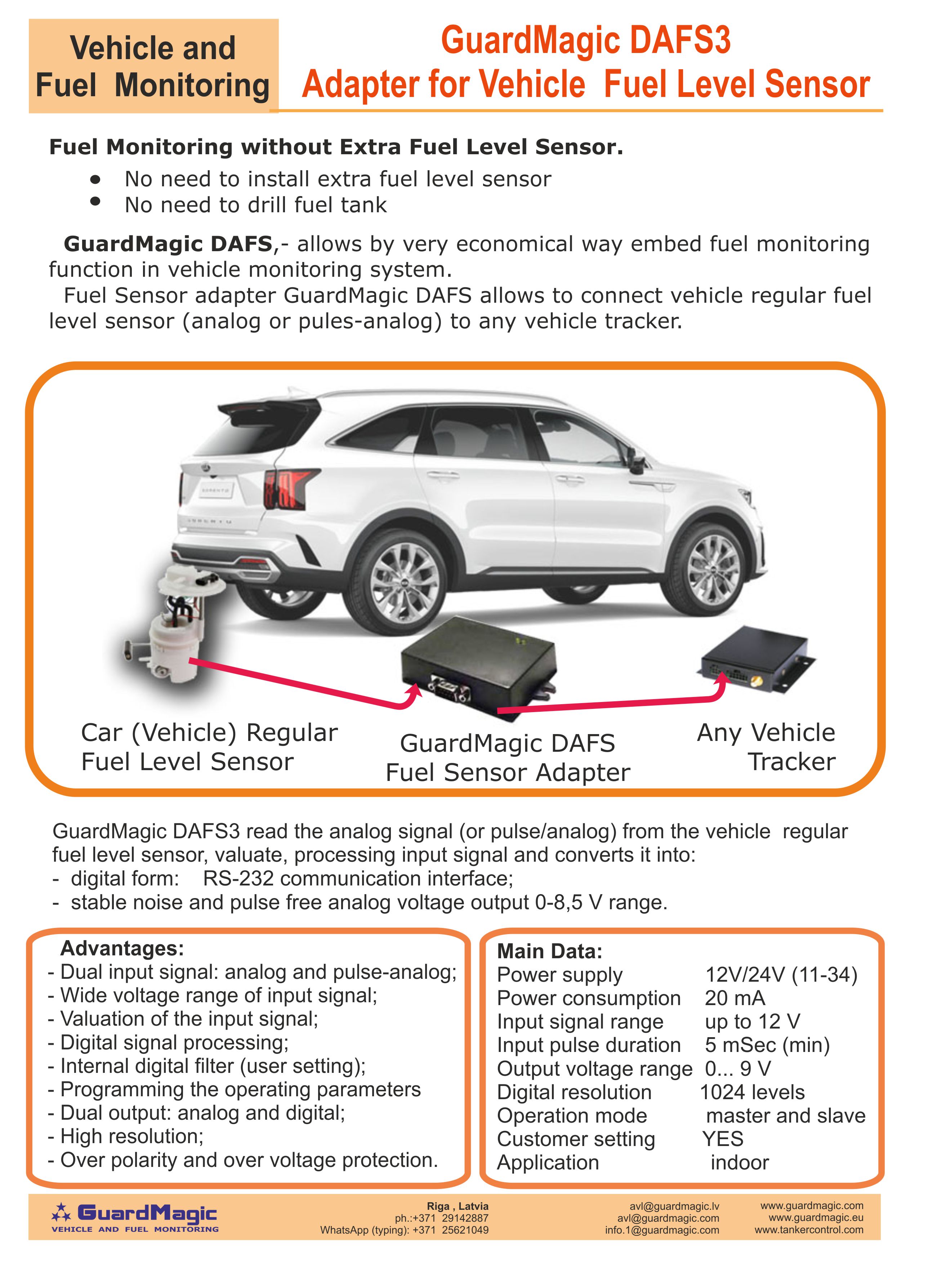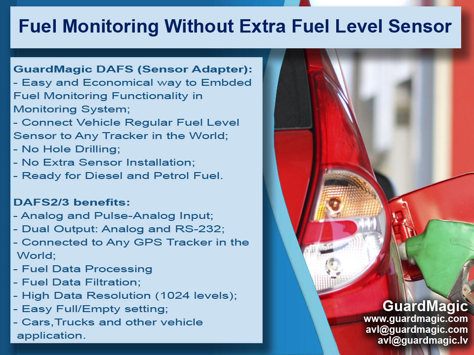 GuardMagic DAFS is intended for connection car, light vehicle, minibuses, LCV resistive type floating fuel level sensor to GPS-GSM/GPRS module.